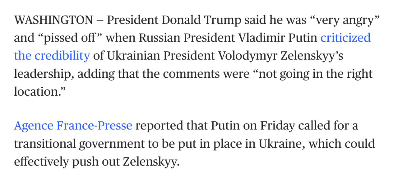 "Трамп заявив, що він був "дуже злий" і "розлючений", коли Володимир Путін розкритикував довіру до керівництва президента України Володимира Зеленського, додавши, що коментарі "не в тому місці"... Путін у п'ятницю закликав до створення перехідного уряду в Україні, який міг би ефективно витіснити Зеленського", - йдеться в повідомленні.