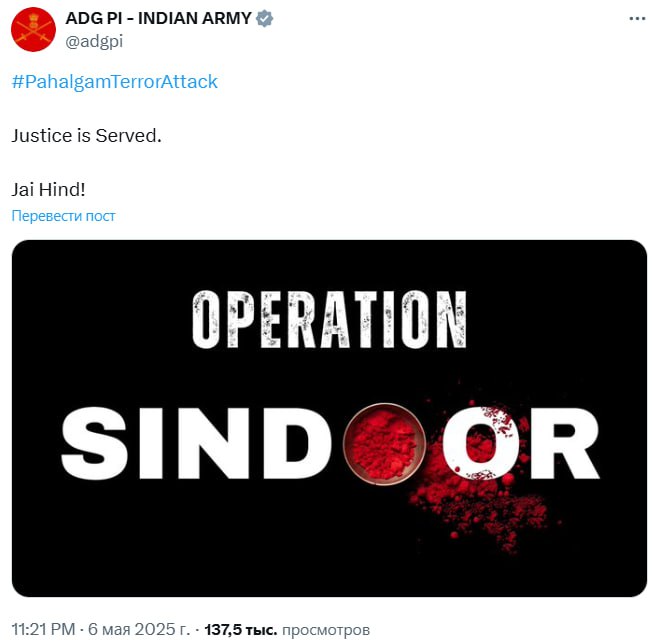 Армія Індії у своєму обліковому записі в соцмережі Х повідомляє про початок "Операції Сіндур".