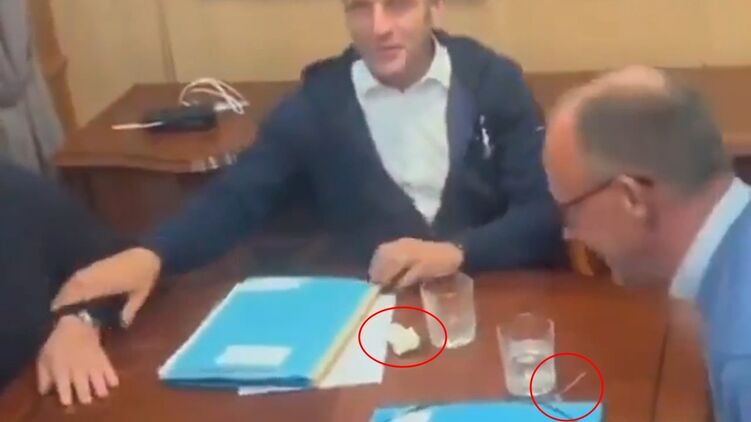 Так речник російського Міністерства закордонних справ Марія Захарова прокоментувала відео, на якому президент Франції прибирає зі столу, за яким сидять Мерц, Туск і Стармер, білий пакетик. А Мерц ховає у руках скляний предмет.