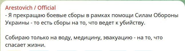 "Я припиняю бойові збори в рамках допомоги Силам оборони України – тобто збори на те, що веде до вбивства. Збираю лише на воду, медицину, евакуацію – на те, що рятує життя", – написав екс-радник Офісу президента, проти якого нещодавно запровадили санкції.