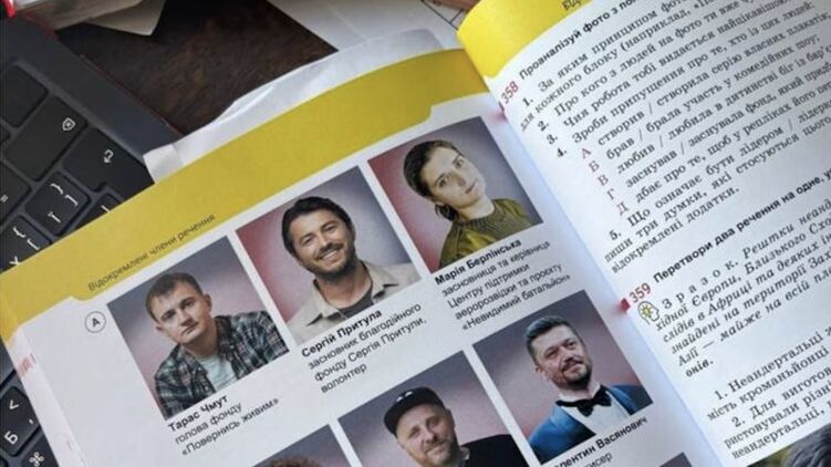 Також у підручнику можна знайти фотографії колишнього шоумена Сергія Притули, керівниці Центру підтримки аеророзвідки Марії Берлінської та волонтера Тараса Чмута.