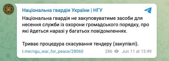 "Національна гвардія не закуповуватиме кошти для несення служби з охорони громадського порядку. Тендер на відповідну закупівлю скасовано", - сказано в повідомленні.