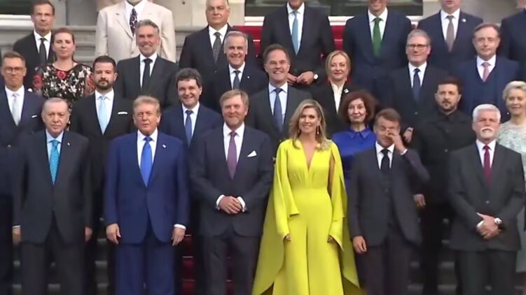 У ролику можна помітити, що форма одягу Емманюелем Макроном, який стоїть поруч із президентом Франції, і головою Єврокомісії Урсулою фон дер Ляйєн Володимира Зеленського сильно відрізняється від костюмів лідерів держав, які приїхали до Гааги.