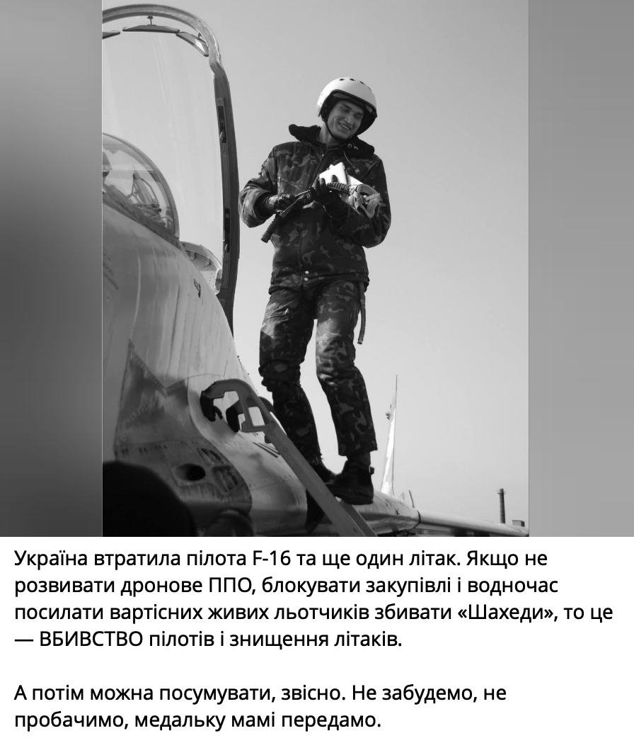 "Україна втратила пілота F-16 і ще один літак. Якщо не розвивати дронове ППО, блокувати закупівлі та одночасно відправляти дорогих пілотів збивати "Шахеди", то це - вбивство пілотів та знищення літаків", - заявила Безугла.