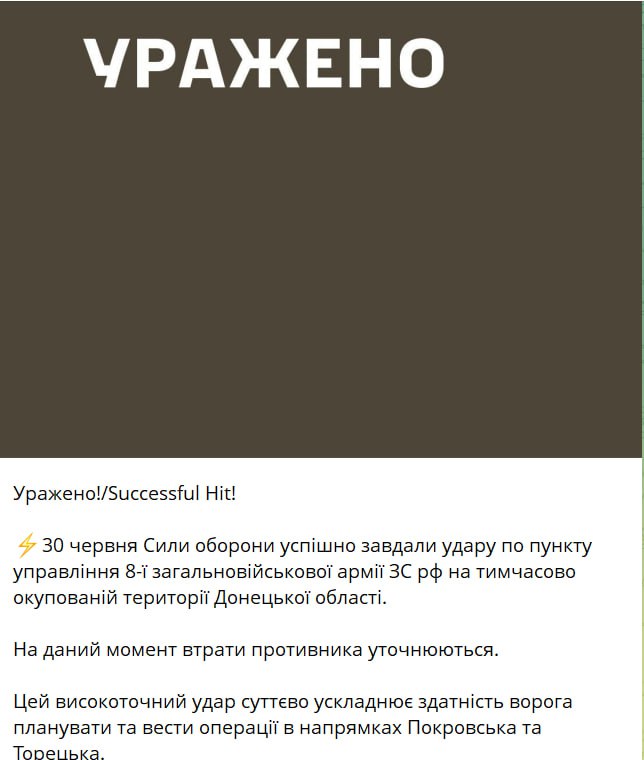 Генеральний штаб Збройних сил України заявляє про поразку пункту управління 8-ї загальновійськової армії РФ під час вчорашнього удару по Донецьку.