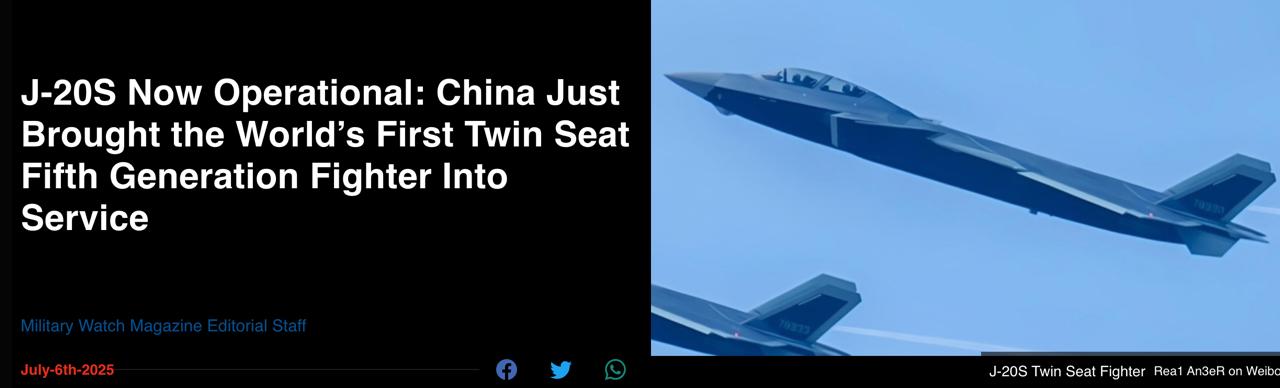 Китай першим у світі запустив двомісний винищувач п'ятого покоління J-20S, який офіційно введено в експлуатацію.