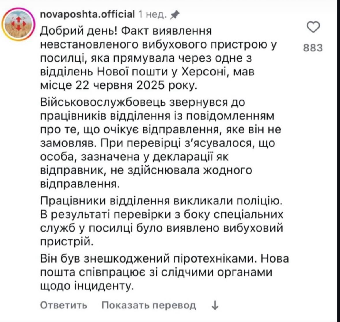 За її інформацією, інцидент стався 22 червня у Херсоні: військовий звернувся до співробітника "Нової пошти" і сказав, що йому надійшло повідомлення про посилку, на яку він не чекав. Під час перевірки з'ясувалося, що зазначений у даних відправник також нічого не відправляв. Поліція та спецслужби під час обстеження посилки встановили, що в ній була вибухівка. Її знищили піротехніки.