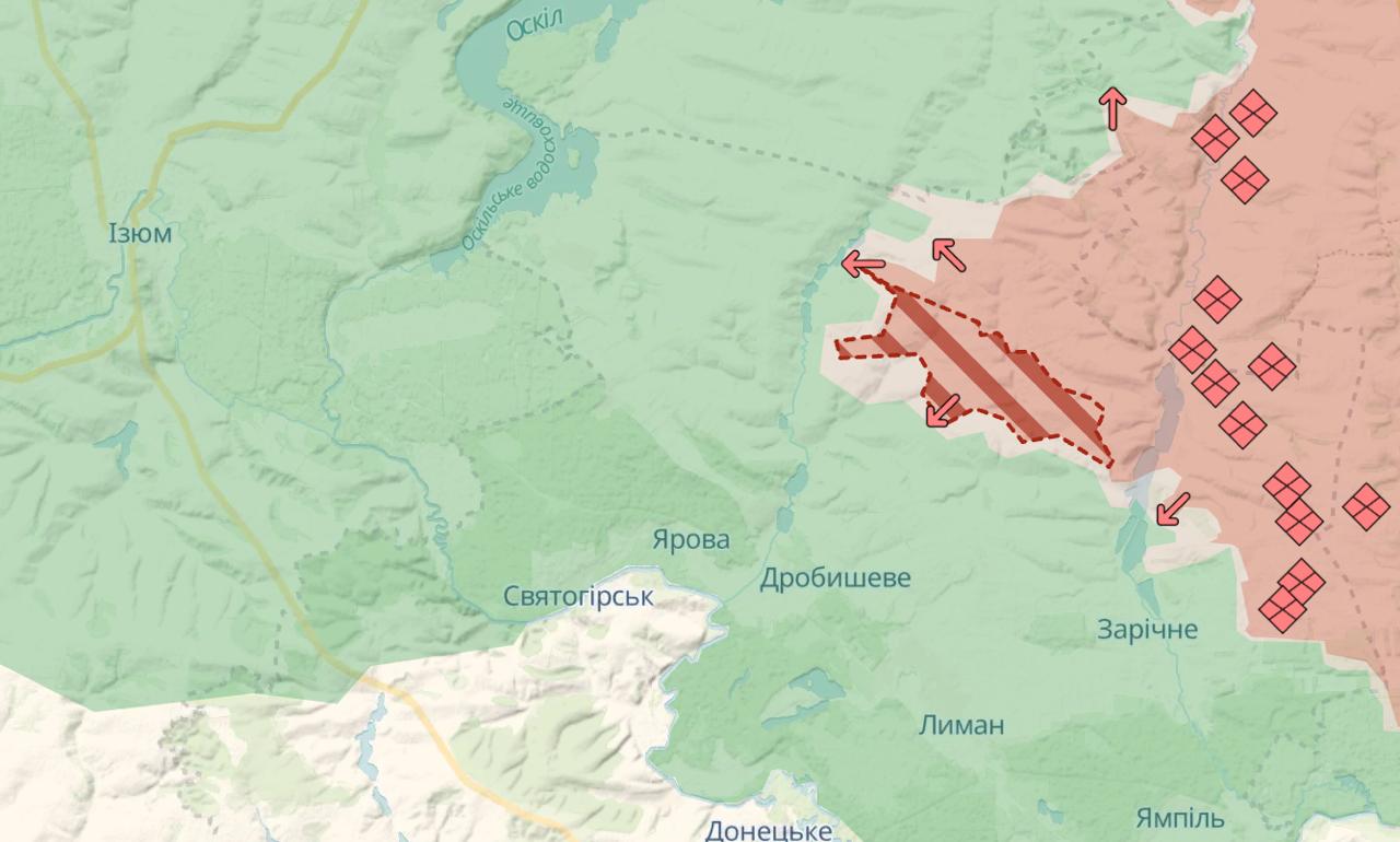 Армія РФ суттєво просунулась у напрямку Святогірська та Лимана, свідчить карта Deep State. Просування відбулося широкими напрямками по лінії сіл Карпівка, Зелена Долина та Колодязі. Зазначимо, що на цій ділянці ще недавно контратакували українські війська, проте суттєво просунутися не змогли і зараз, зважаючи на все, ініціативу знову перехопили росіяни.