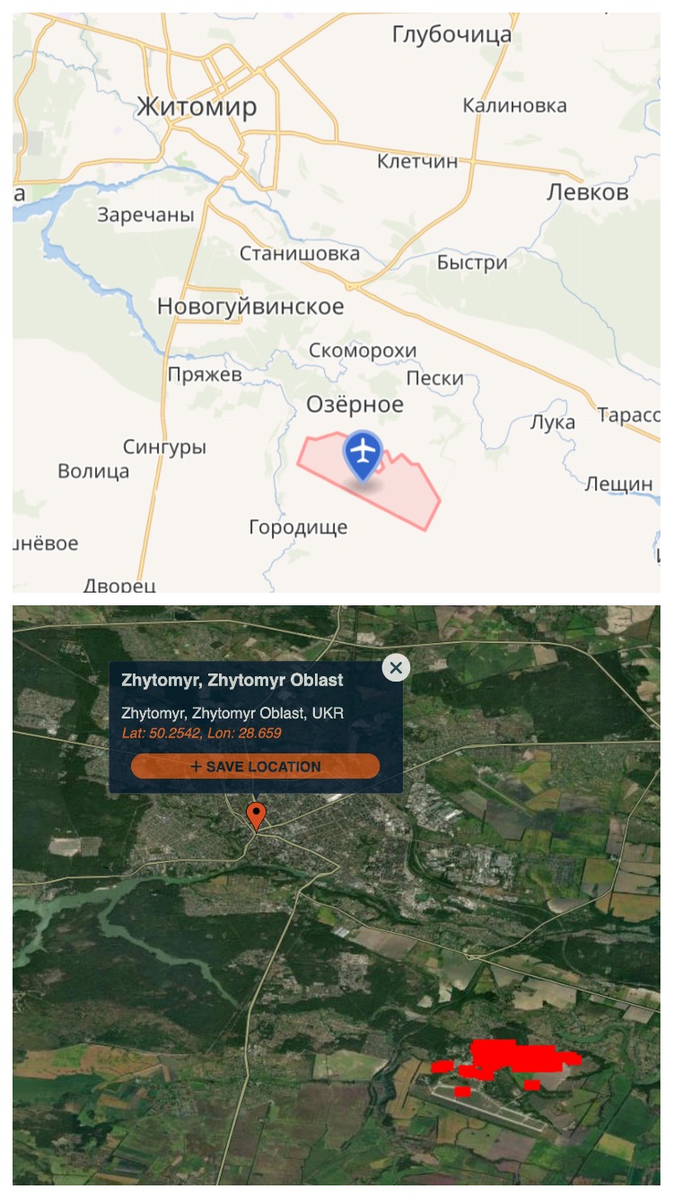 При цьому російські паблики заявляють, що удар там завдавав аеродрому Озерне під Житомиром. Україна цього не підтверджувала. Однак, за даними сервісу NASA Firms, саме на цій ділянці карти навіть у другій половині дня тривала сильна пожежа.