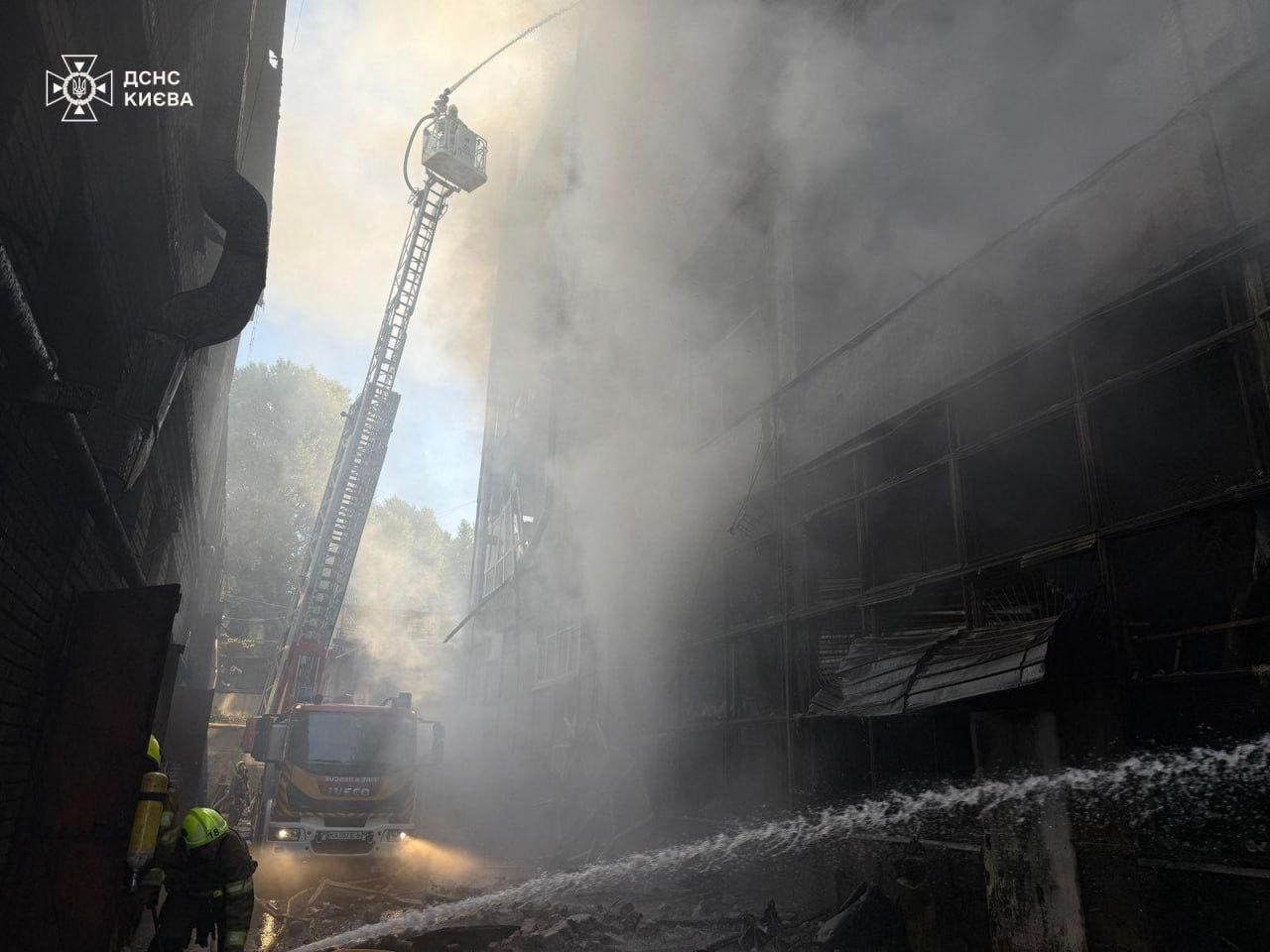 У Солом'янському районі вогонь охопив адміністративні та складські будівлі. В одній із споруд триває ліквідація наслідків удару.