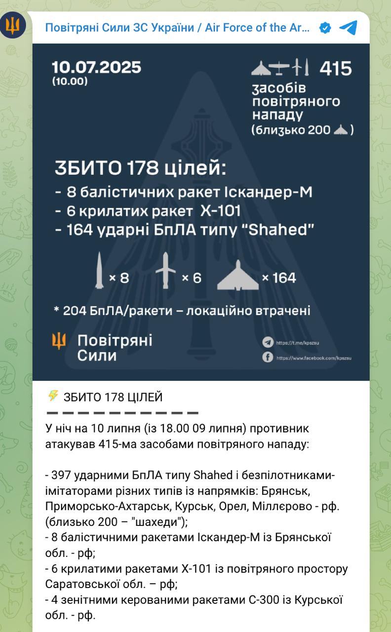 Також було збито всі 8 "Іскандерів", всі 6 крилатих ракет Х-101. 4 ракети С-300 збити не вдалося.