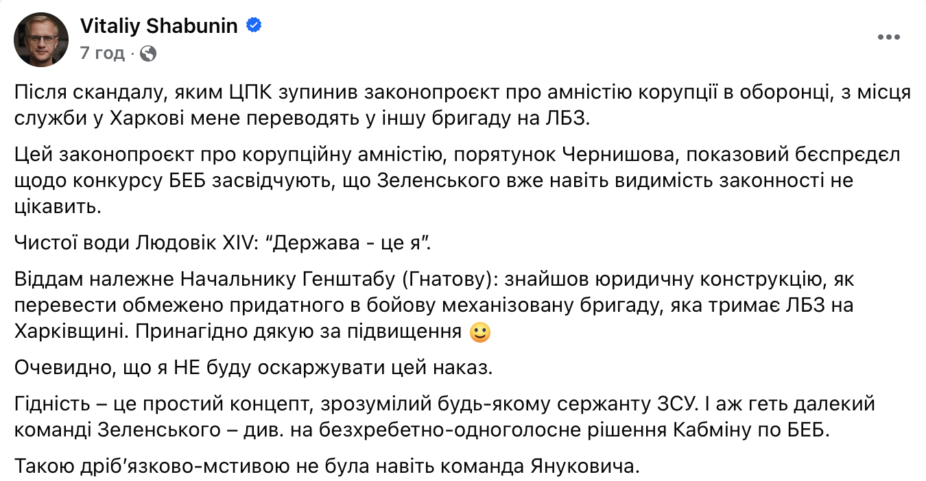 "Цей законопроєкт про корупційну амністію, порятунок Чернишова, показовий бєспрєдєл щодо конкурсу БЕБ засвідчують, що Зеленського вже навіть видимість законності не цікавить. Чистої води Людовік XIV: “Держава - це я”. Віддам належне Начальнику Генштабу (Гнатову): знайшов юридичну конструкцію, як перевести обмежено придатного в бойову механізовану бригаду, яка тримає ЛБЗ на Харківщині. Принагідно дякую за підвищення", - написав Шабунін.