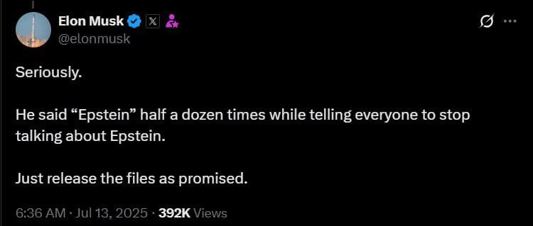 "Серйозно. Він сказав "Епштейн" півдюжини разів, одночасно закликаючи всіх припинити говорити про Епштейн. Просто опублікуйте файли, як і обіцяли", - написав Маск у відповідь на пост у X.