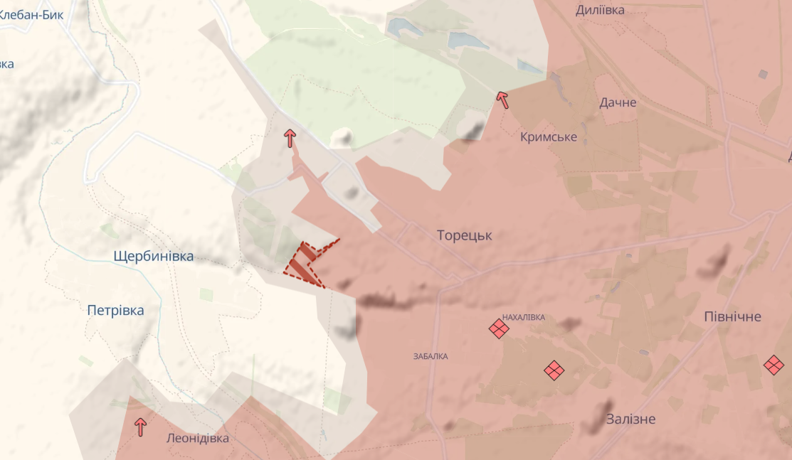 Також армія РФ настає біля Торецька, Диліївки (на північний захід від Покровська) та Красного Першого (на північ від Куп'янська).