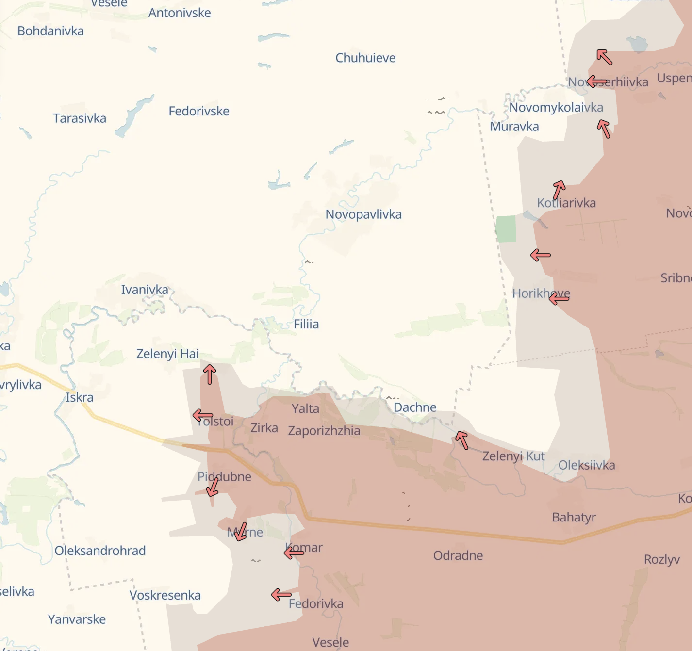 Також противник рухається на захід від Толстого у бік Іскри, займаючи низку позицій. Північніше відбуваються стабілізаційні заходи в Новохатському, а на захід — наступ у напрямку Зеленого Гаю. Село Грушевське перейшло під контроль російських сил.