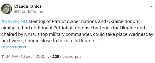 "Зустріч країн - власників ракет Patriot і країн - донорів України, метою якої є пошук додаткових батарей ППО Patriot для України, під головуванням головнокомандувача військ НАТО може відбутися в середу наступного тижня, повідомило агентство Reuters джерело, близьке до переговорів", - написала Таніос.