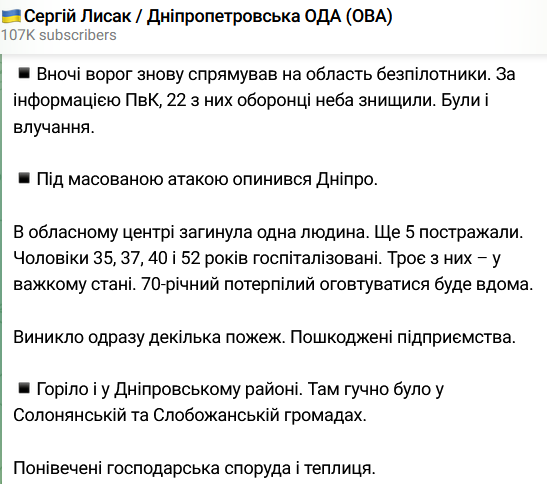 "В обласному центрі загинула одна людина. Ще 5 людей постраждали. Чоловіків 35, 37, 40 та 52 років госпіталізовано. Троє з них – у тяжкому стані", - написав Лисак.