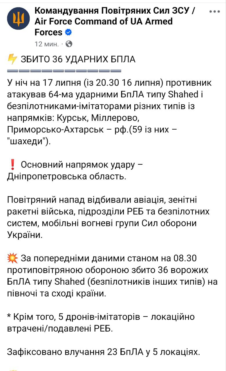 За попередніми даними, до ранку збито 36 "Шахедів" на півночі та сході країни. Ще п'ять дронів-імітаторів було придушено засобами РЕБ.