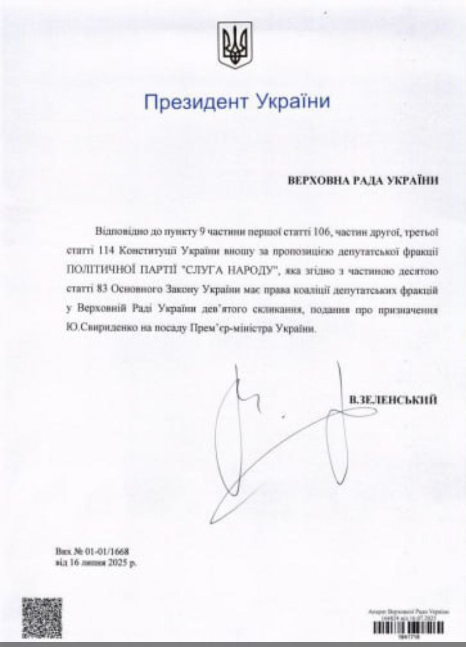 Тим часом, президент Володимир Зеленський вніс у Верховну Раду кандидатуру нового прем'єр-міністра Юлії Свириденко. Відповідний документ датовано вчорашнім днем, 16 липня.