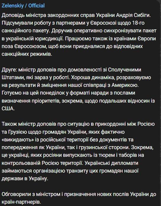 Також президент повідомив, що обговорив із Сибігою призначення нових послів України до країн-партнерів, а також роботу з партнерами в Євросоюзі щодо 18-го санкційного пакету проти РФ.