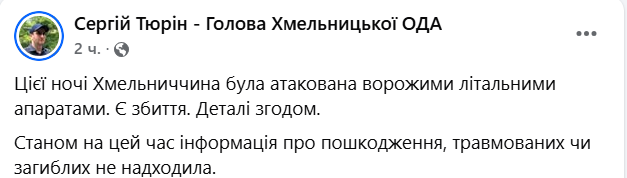 "Цієї ночі Хмельниччина була атакована ворожими літальними апаратами. Є збиття. Деталі згодом", - написав він.