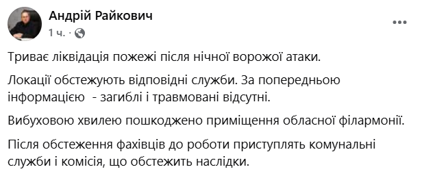 Крім того, вибухи лунали у Кропивницькому. Вибуховою хвилею пошкоджено приміщення обласної філармонії, повідомляє голова ОВА Андрій Райкович.