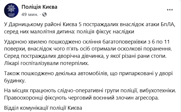 У Дарницькому районі Києва п'ятеро людей постраждали внаслідок атаки РФ, серед них дворічна дитина, повідомляє Нацполіція.