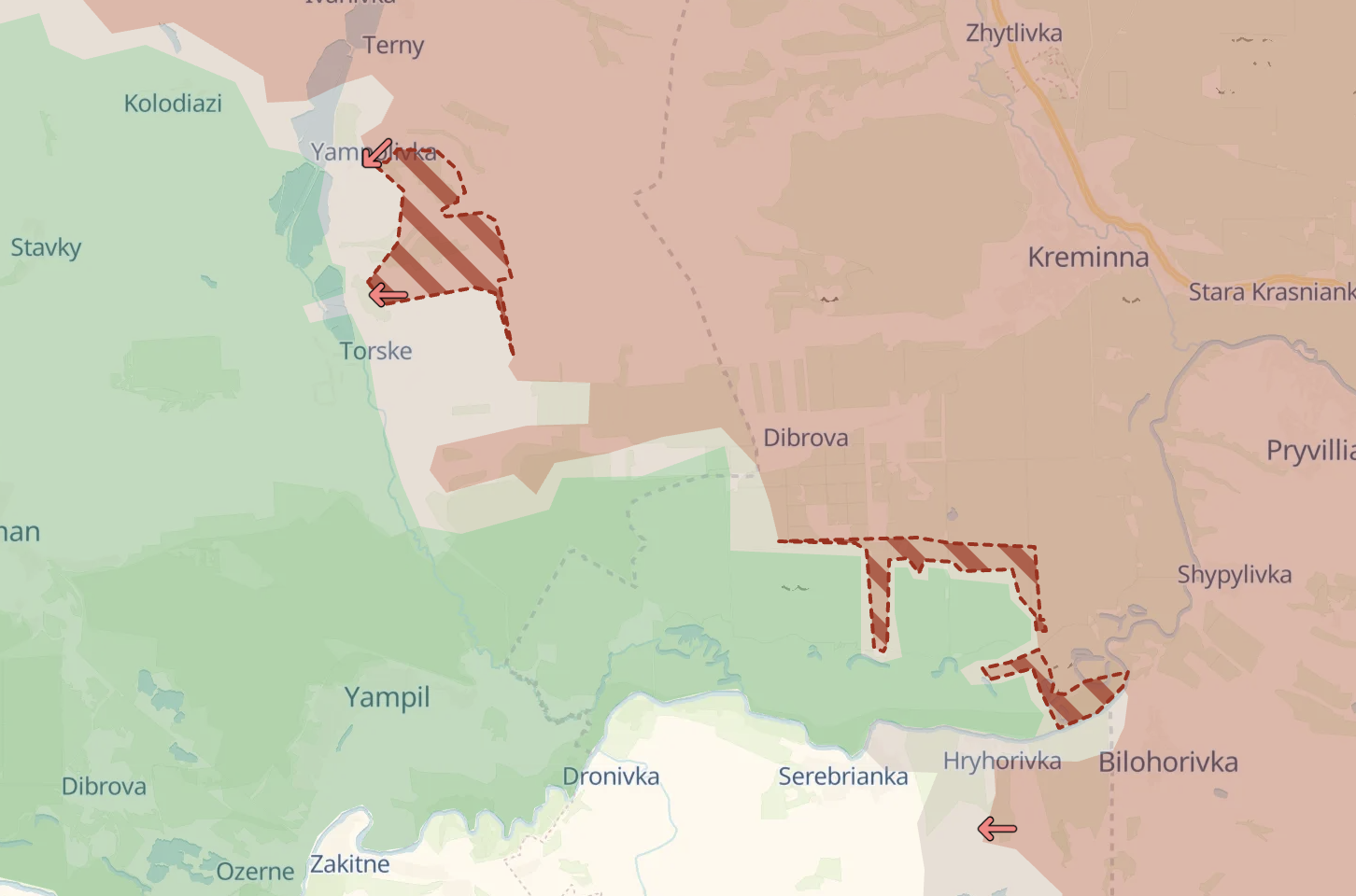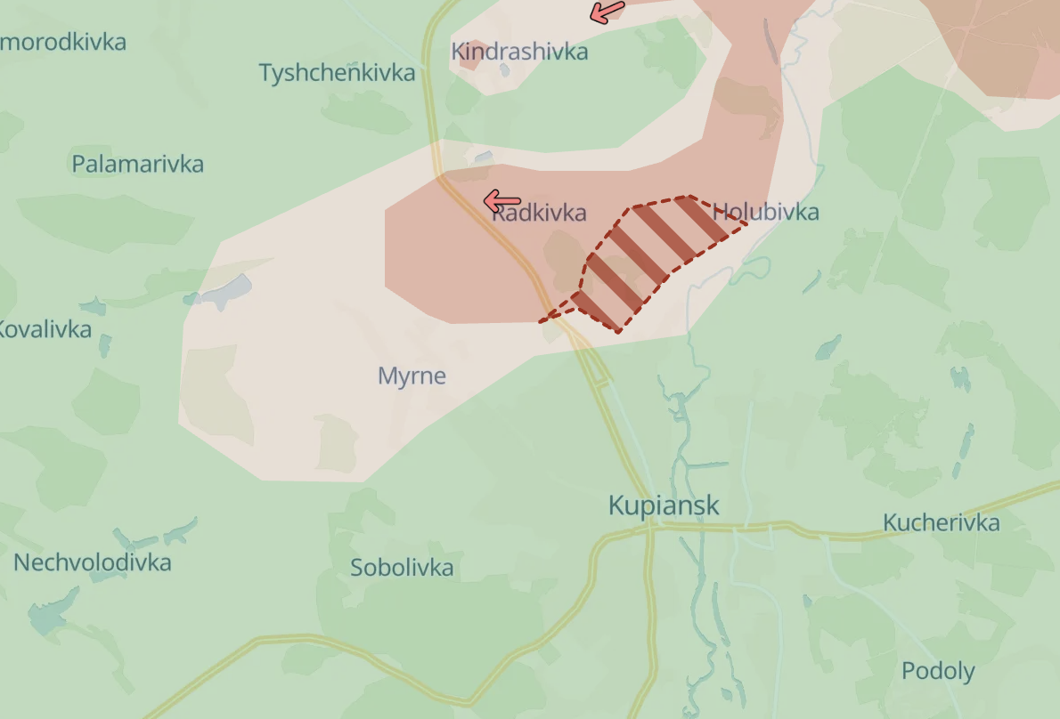 Також війська РФ просунулися на північ від Куп'янська в районі Голубівки. Якщо подивитися на карту, то мета руху росіян на даній ділянці фронту очевидна – оточити Куп'янськ зі Сходу. На карті DeepState видно, що зона боїв (сіра зона) охопила селище мирне і наближається до Соболівки, з якої прострілюватиметься головна дорога постачання Куп'янська.