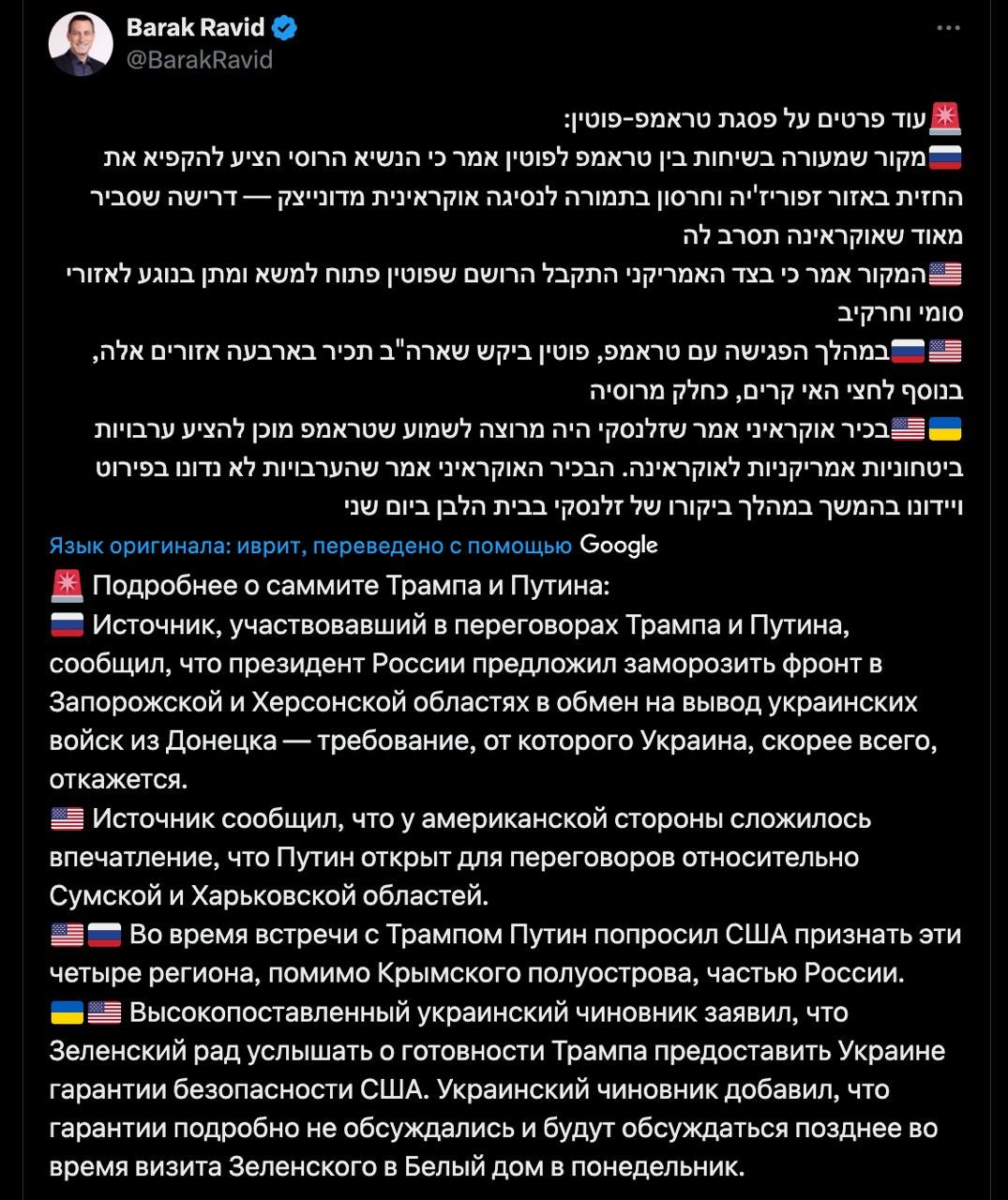 Така конфігурація угоди обговорювалася ще напередодні зустрічі Путіна і Трампа після візиту представника президента США Стівена Віткоффа до Москви.