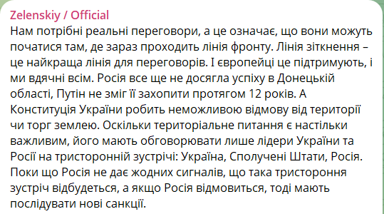"Росія досі не досягла успіху в Донецькій області, Путіну не вдалося захопити її протягом 12 років. А Конституція України унеможливлює відмову від території або торгівлю землею. Оскільки територіальне питання має таке велике значення, його повинні обговорювати виключно лідери України та Росії на тристоронній зустрічі: Україна, Сполучені Штати, Росія. Поки що Росія не подає жодних сигналів, що така зустріч відбудеться, а якщо Росія відмовиться, то мають бути нові санкції", – сказав Зеленський.