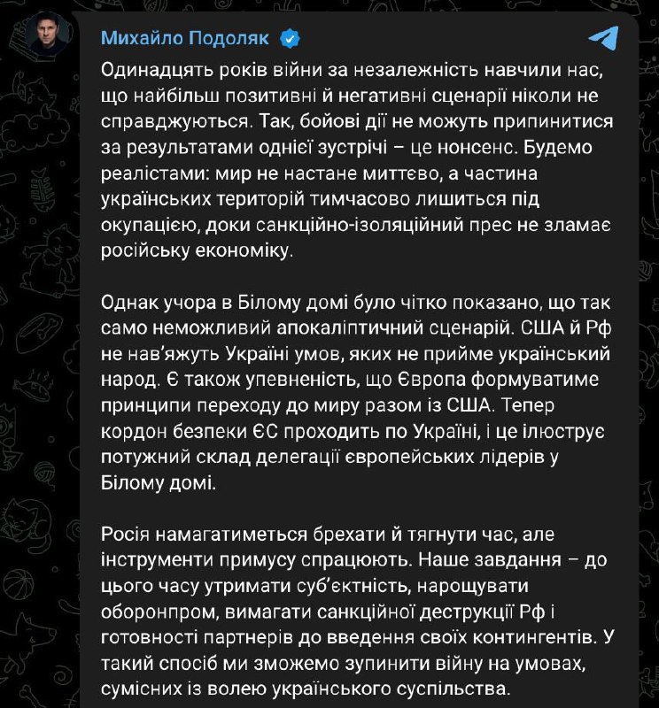 "Наше завдання - до цього часу зберегти суб'єктність, нарощувати оборонну промисловість, вимагати санкційної деструкції РФ та готовності партнерів до запровадження своїх контингентів. Таким чином ми зможемо зупинити війну на умовах, сумісних із волею українського суспільства", - написав Подоляк.