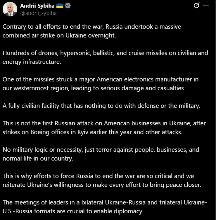 "Одна з ракет вразила великий американський виробник електроніки в нашому західному регіоні, що призвело до серйозних руйнувань і жертв. Повністю цивільний об'єкт, який не має жодного відношення до оборони або військових операцій", - написав він.