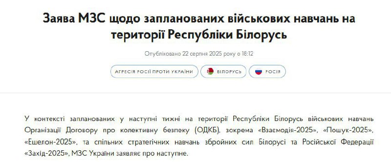 Україна рекомендувала військовим Білорусі не наближатися до кордонів під час російсько-білоруських військових навчань "Захід-2025".