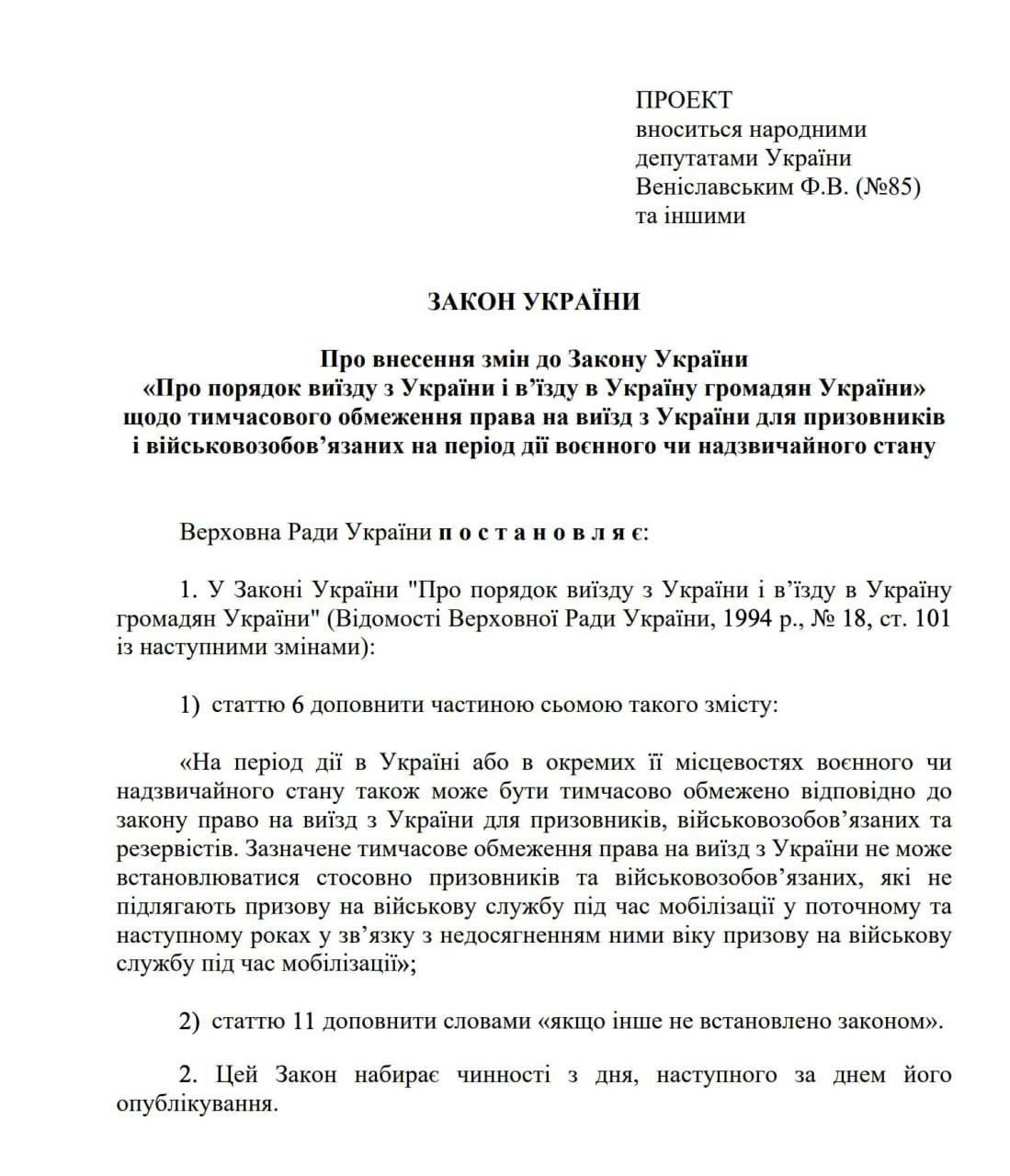 До Верховної Ради внесено законопроект №13685, який дозволяє виїзду за кордон чоловікам віком до 24 років.