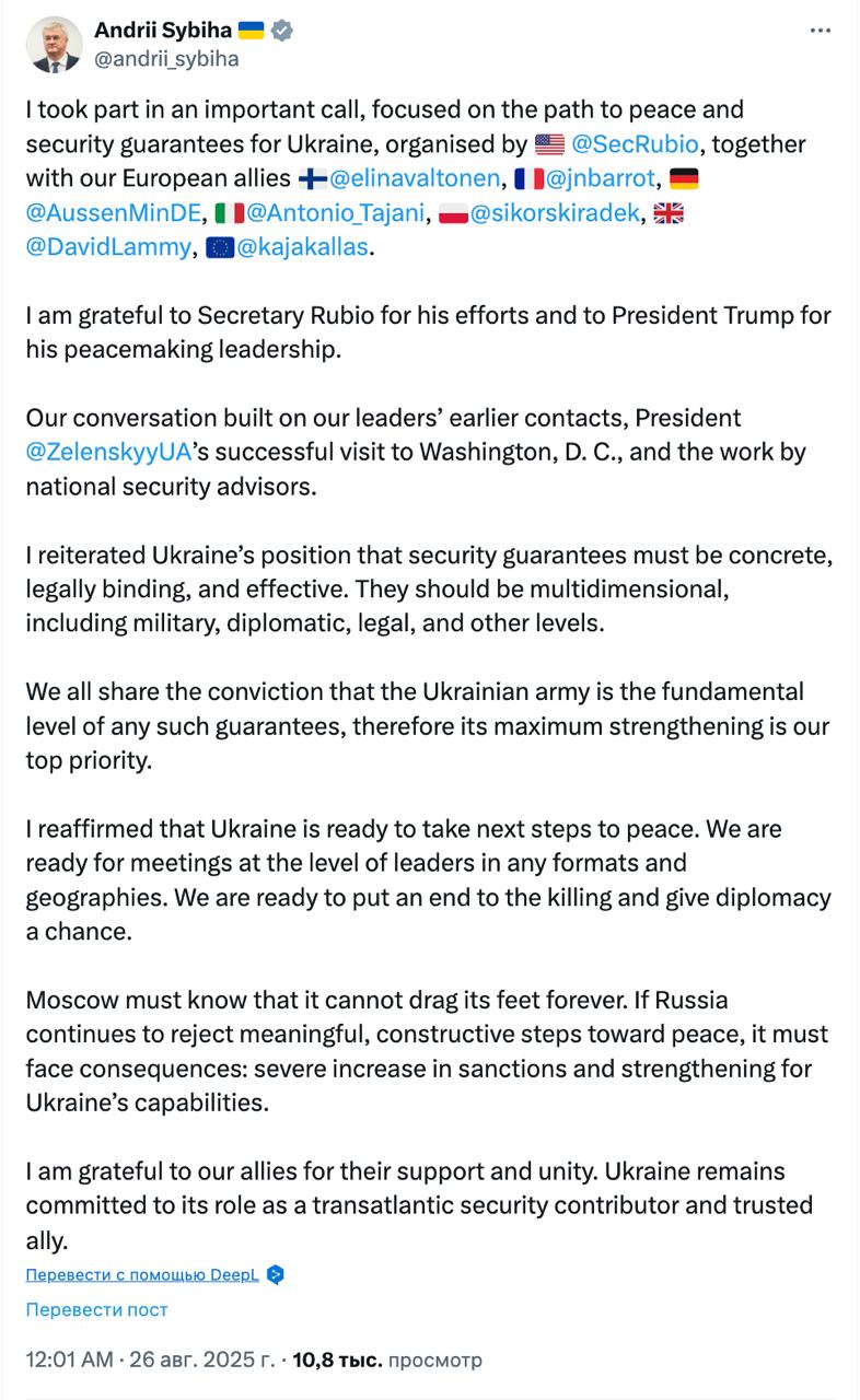 "Я підтвердив позицію України, що гарантії безпеки мають бути конкретними, юридично обов'язковими та ефективними. Вони мають бути багатоплановими, включаючи військовий, дипломатичний, правовий та інші рівні. Ми всі поділяємо переконання, що українська армія є фундаментальним рівнем будь-яких таких гарантій, тому її максимальне зміцнення є нашим головним пріоритетом", - заявив Сибiга.