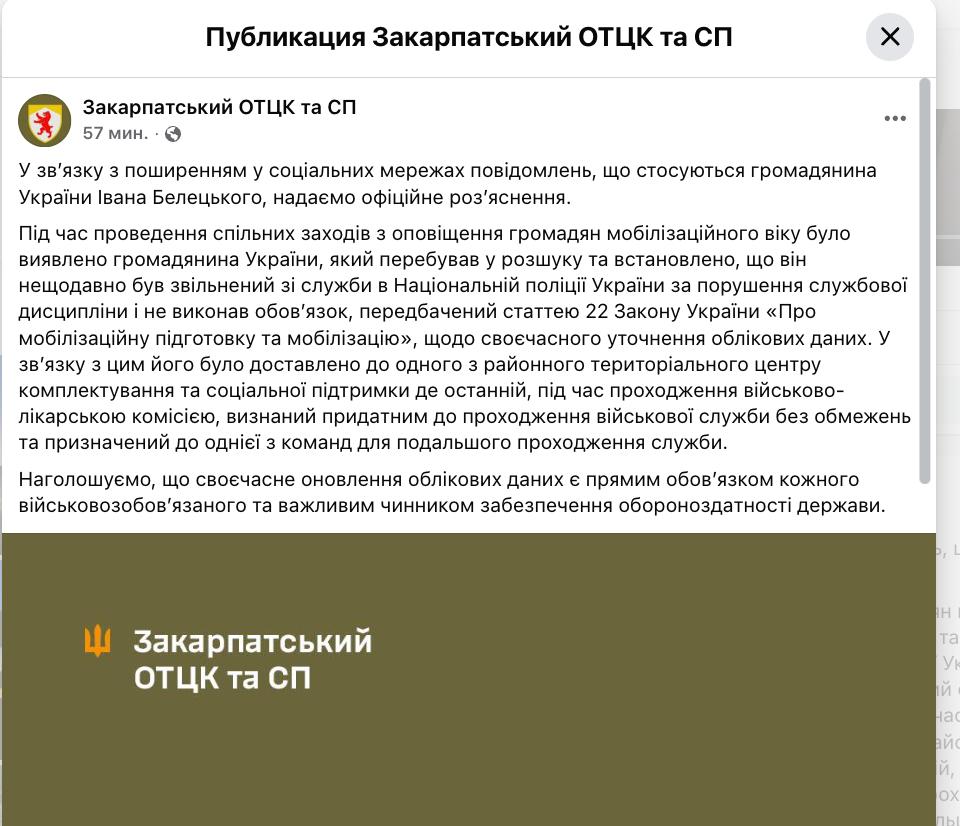 У ТЦК заявили, що екс-правоохоронець після звільнення вчасно не оновив своїх даних, а тому опинився в розшуку. Медкомісія не виявила у нього обмежень на службу в армії, Білецького було мобілізовано загалом.