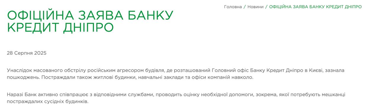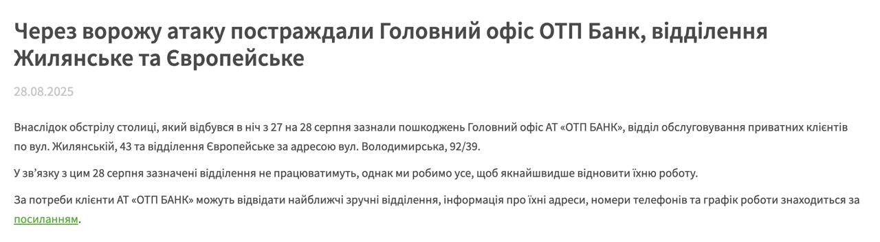 10:58 У районі Жилянської у центрі Києва обстрілом пошкоджено офіси двох банків – Кредит Дніпро та ОТП.