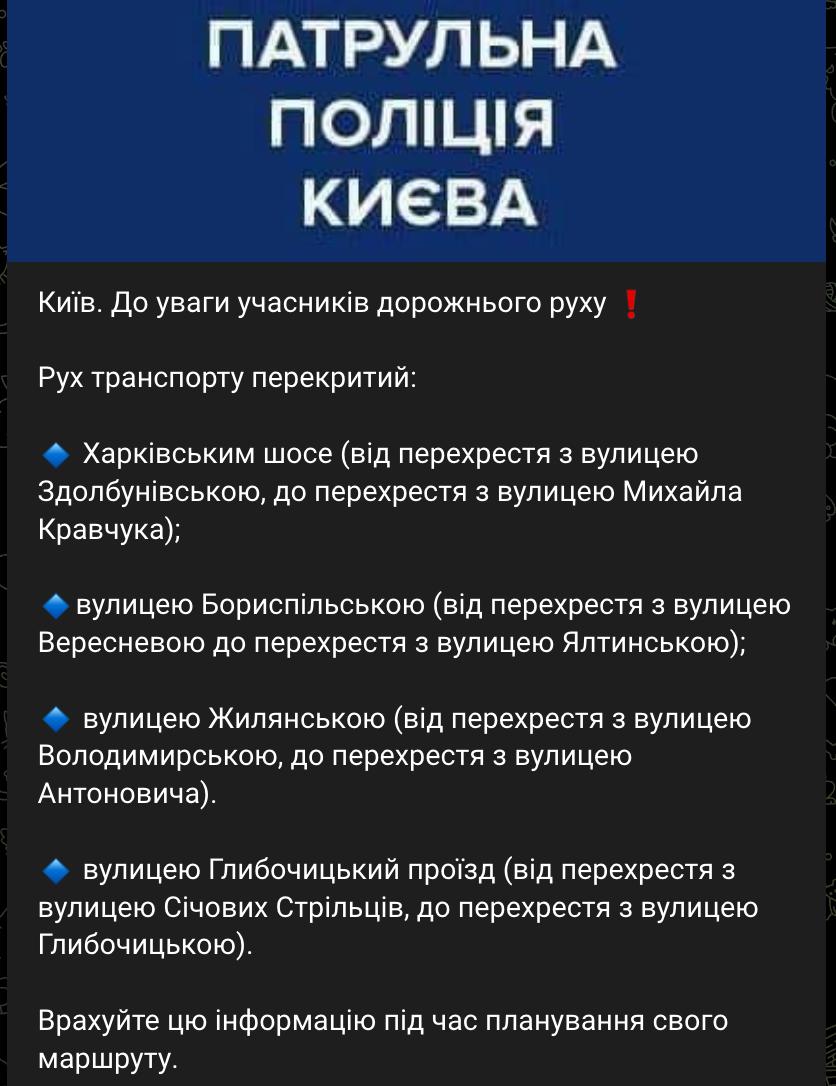 07:53 У Києві перекрили частину вулиць після нічного масованого обстрілу - як у центрі, так і на лівому березі (район Харківського шосе та Бориспільської).