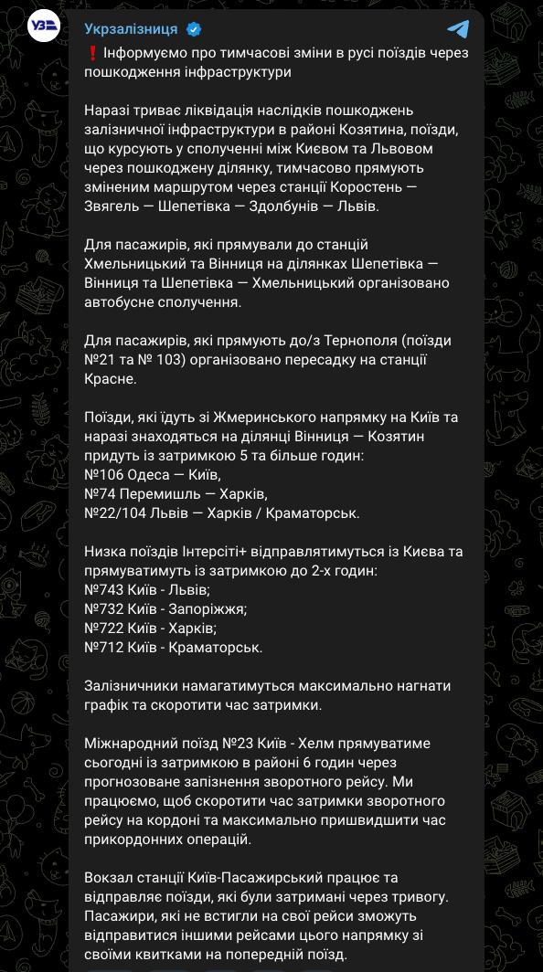 "Укрзалізниця" підтвердила, що удар там був по залізничному вузлу, і тепер змінюється графік поїздів. Також постраждав парк поїздів Інтерсіті+, один потяг отримав серйозні пошкодження.