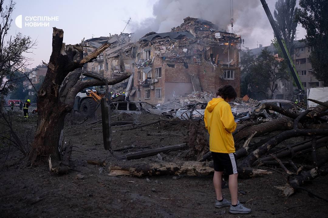 07:49 Кадри зруйнованого житлового будинку на Дарниці у Києві, де були загиблі після обстрілу.