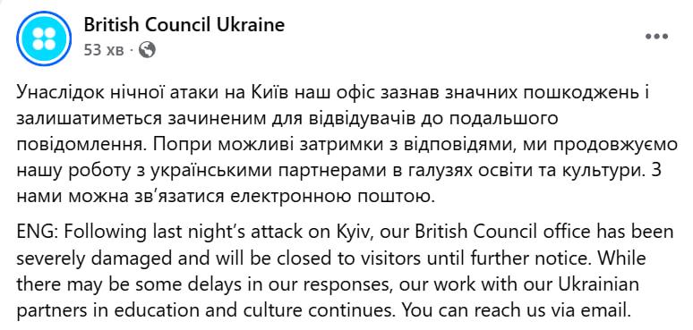 11:23 У Києві пошкоджено офіс Британської Ради, він закрився.