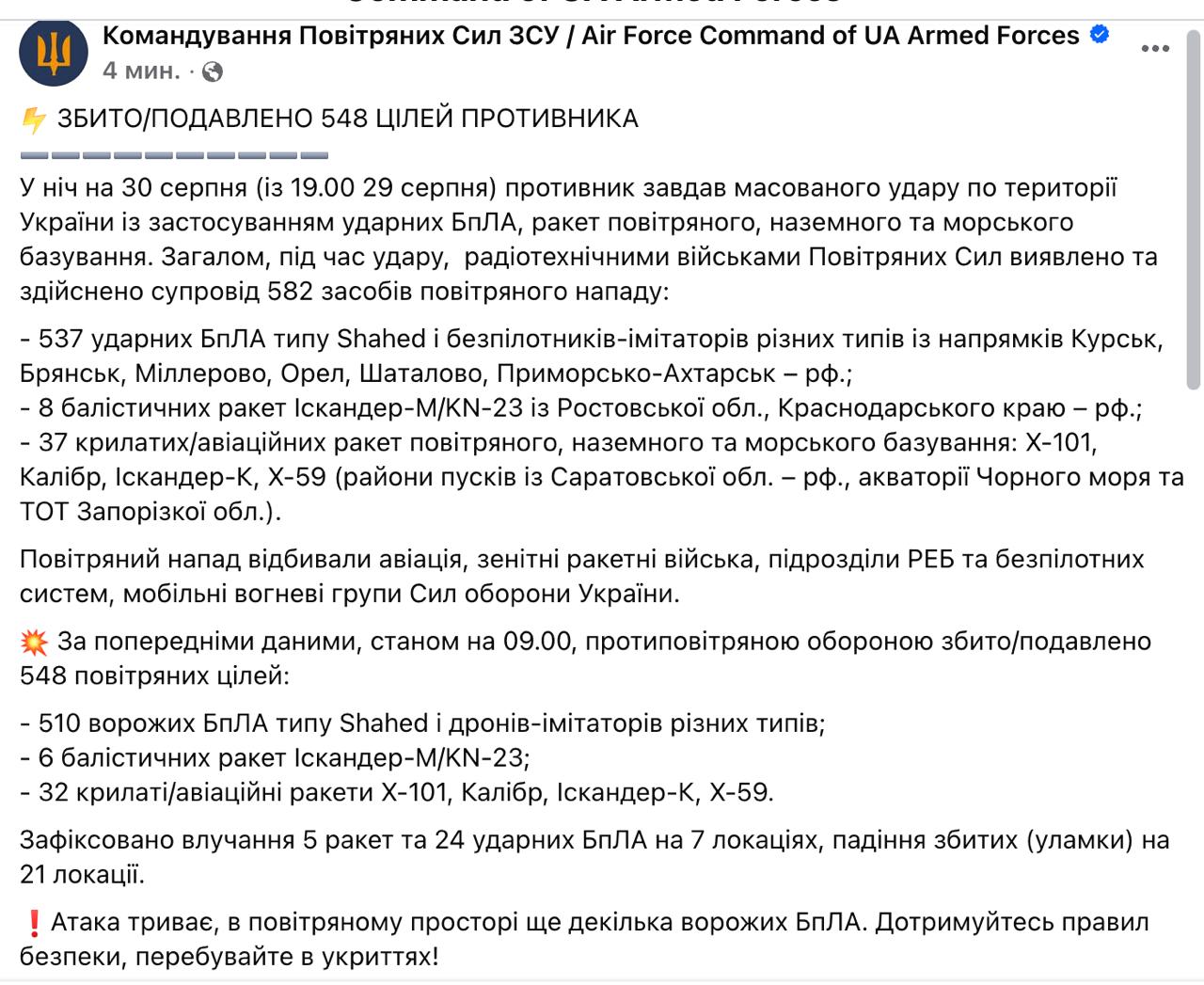 9.11 Вночі по Україні було випущено 45 ракет, 38 із них збито, заявляють ЗСУ.