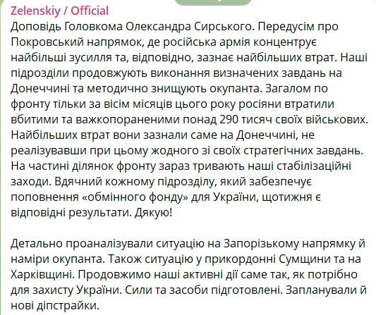 Про це Зеленський повідомив у своєму телеграм-каналі за підсумками наради з головкомом ЗСУ Олександром Сирським.
