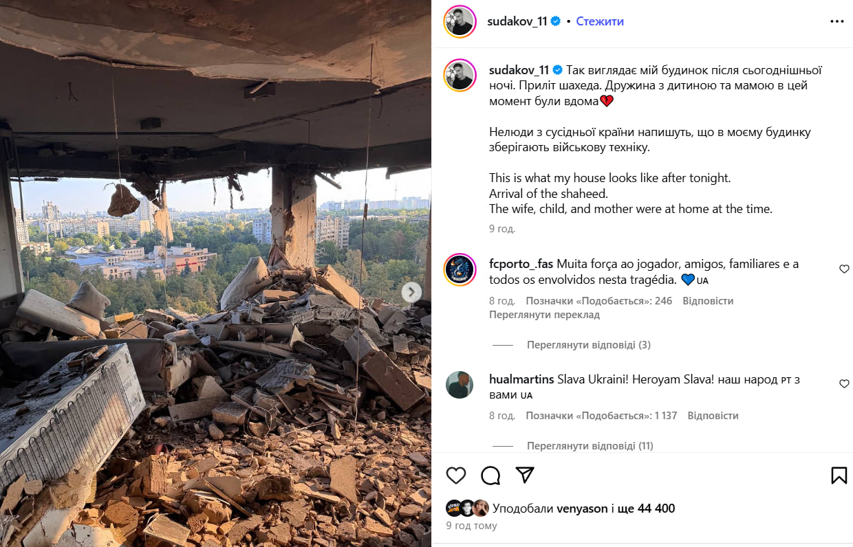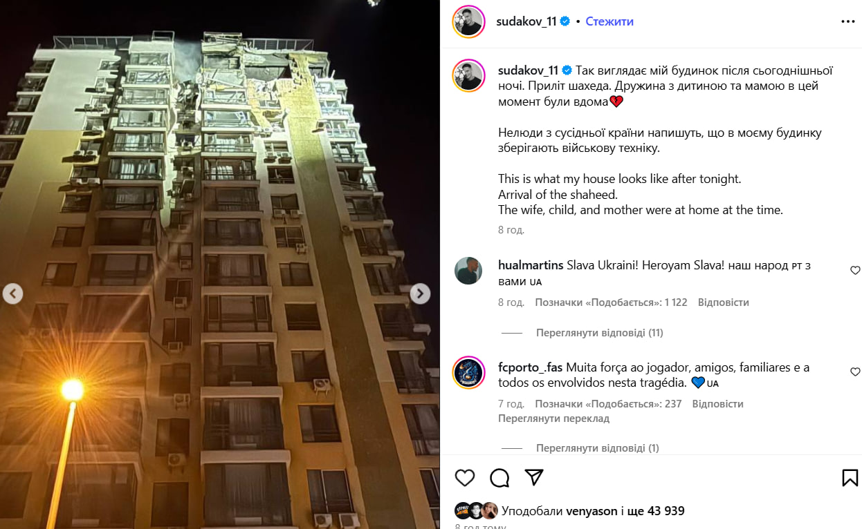 Під час атаки російських безпілотників на Київ, що сталася в ніч проти неділі, 7 вересня, було пошкоджено будинок півзахисника збірної України Георгія Судакова.