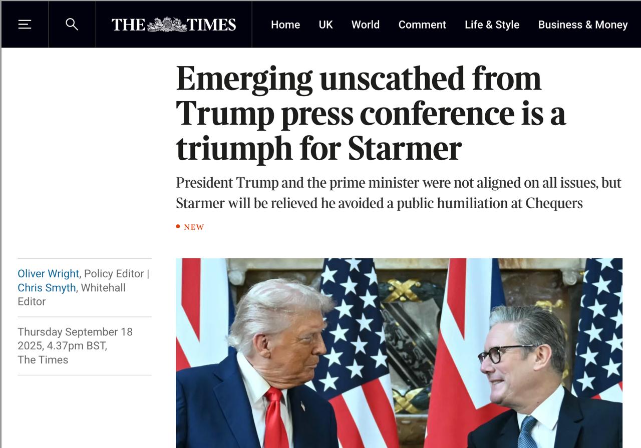 "Хоч тон був теплим, а президент не скупився на похвали Стармера, їх розбіжності — від Гази до достоїнств вітряних турбін — були очевидні. Хоча Стармер був радий почути від Трампа, що президент Володимир Путін "справді підвів його", не було жодних ознак того, що ці почуття переростуть у більш сильний. Палестинського держави є "одним з наших небагатьох розбіжностей". Трамп запропонував Стармеру "залучити військових", щоб покласти край нелегальній міграції. навмисно ухилявся від відповідей на провокаційні питання щодо свободи слова у Великій Британії, незважаючи на свої загальновідомі погляди на це питання", - пише The Times.