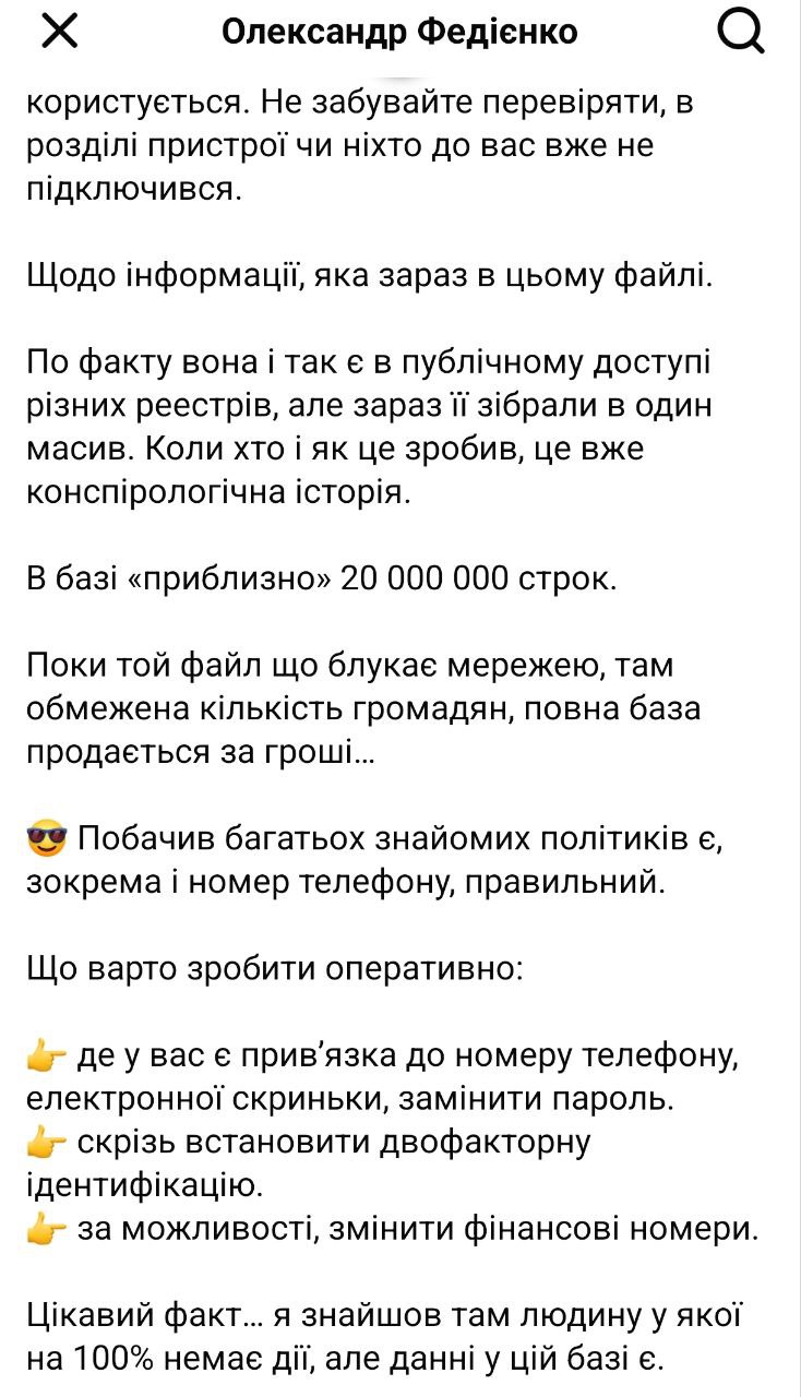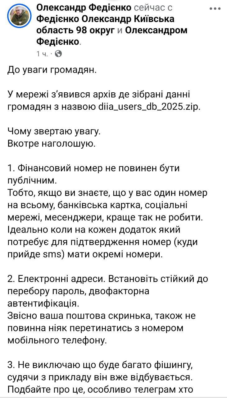 Федієнко радить терміново змінити паролі скрізь, де є прив'язка до телефону чи електронної пошти, включити двофакторну автентифікацію та по можливості змінити фінансові номери.