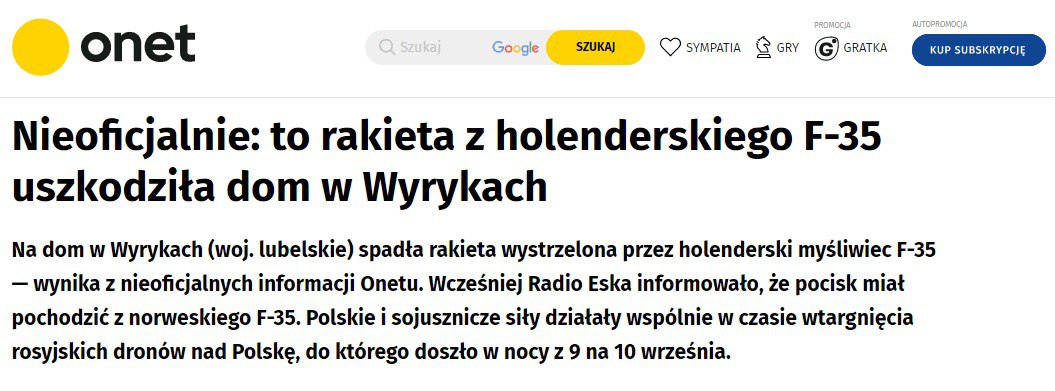 А за інформацією радіостанції Eska, ракета, ймовірно, була випущена з норвезького F-35.
