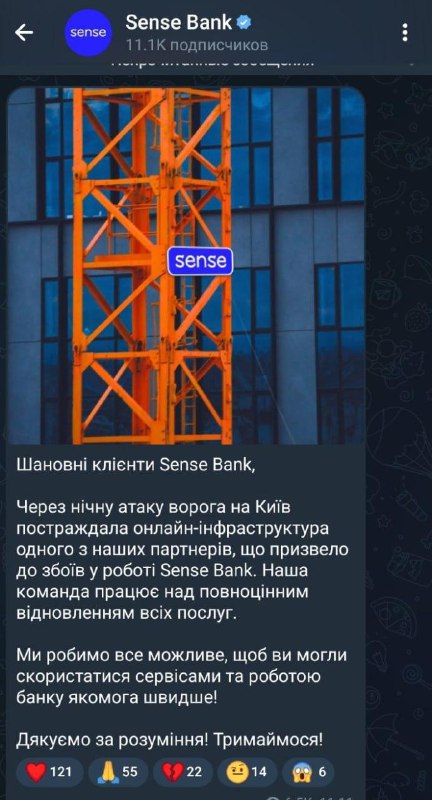 "Через нічну атаку ворога на Київ постраждала онлайн-інфраструктура одного з наших партнерів, що призвело до збоїв у роботі Sense Bank. Наша команда працює над повноцінним відновленням послуг", - йдеться в офіційному повідомленні держбанку в соцмережах.