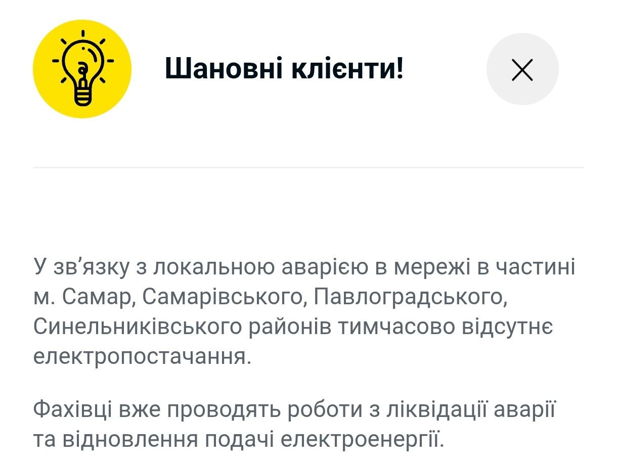 08:34 У частині міста Самар на Дніпропетровщині, а також у Самарівському, Павлоградському та Синельниківському районах тимчасово відсутнє електропостачання через аварію в мережі, повідомили у ДТЕК.