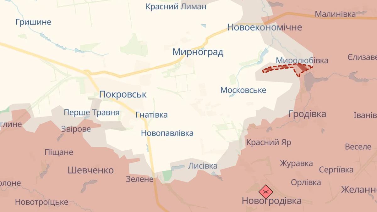 09:39 Росіяни вперше за довгий час просунулися на схід від Мирнограду – на 4-5 кілометрів з боку Миролюбівки, повідомляє Deep State.